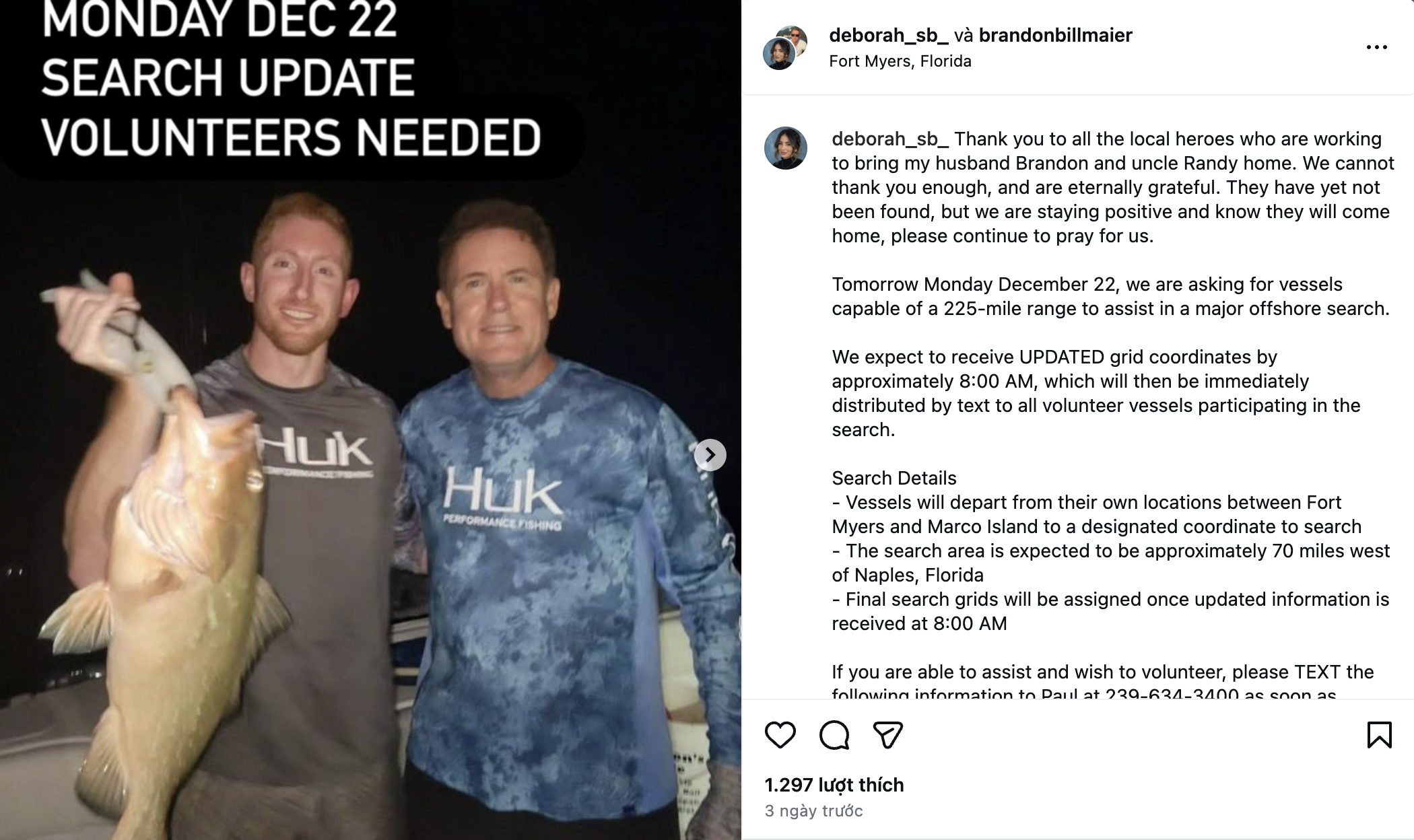 In her post, Deborah provided critical details about the next stage of the search and made an urgent plea for vessels to join. “Tomorrow, Monday, December 22, we are asking for vessels capable of a 225-mile range to assist in a major offshore search,” she wrote. Volunteers are instructed to expect updated grid coordinates by 8:00 AM, which will be immediately distributed via text to all participating vessels. The search area is expected to cover approximately 70 miles west of Naples, Florida, with final grids assigned once updated information is received.
