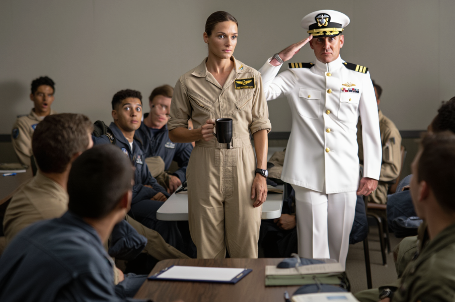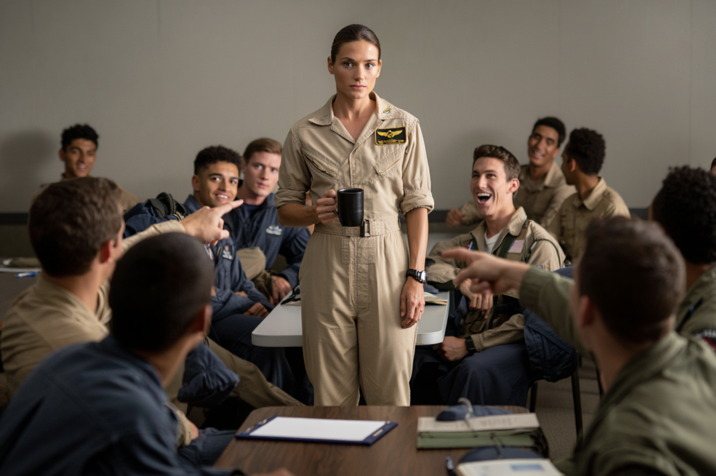 I stayed in the back row, black coffee in hand, posture rigid but relaxed enough to appear natural. Khaki sleeves rolled to regulation, hair pinned neatly, no name tape on the crisp new uniform that had been handed to me barely an hour ago. The hum of the air conditioning mingled with the faint aroma of jet fuel lingering from the planes parked outside. Around me, the chatter of young pilots reminded me of a hundred small dogfights in progress—hands slicing the air, call signs dropping like coins into a wishing well of ego. Behind me, someone snickered: “Secretaries sit outside.” Their laughter skimmed the surface like a thin film, never bothering to see if I heard.