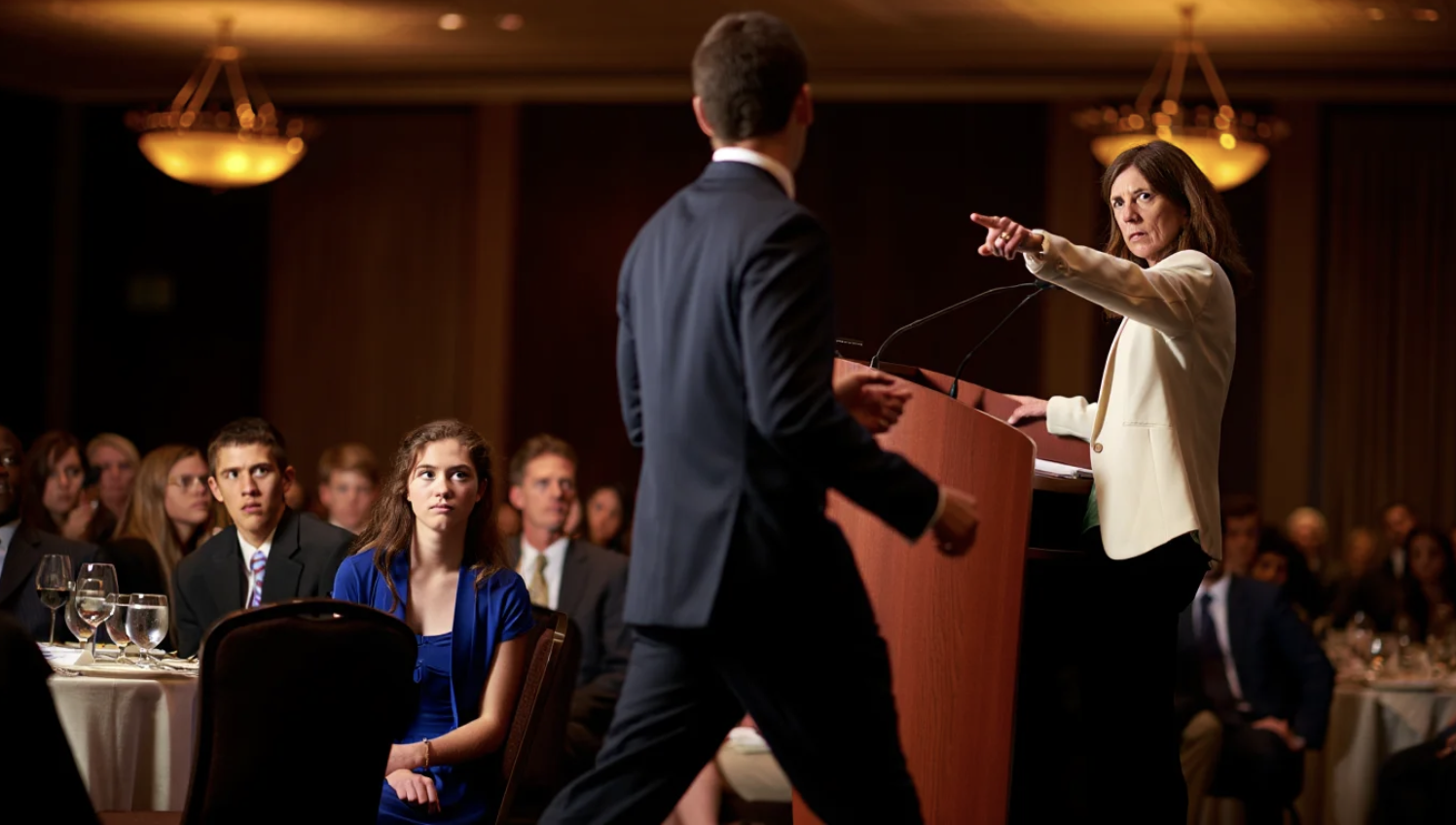 Inside, the banquet hall was all amber lights and polished wood. White linens. Crystal water glasses. A podium at the far end beneath the university seal. Student volunteers in black slacks moved carefully between tables with the tense expressions of people carrying plates more expensive than their cars.