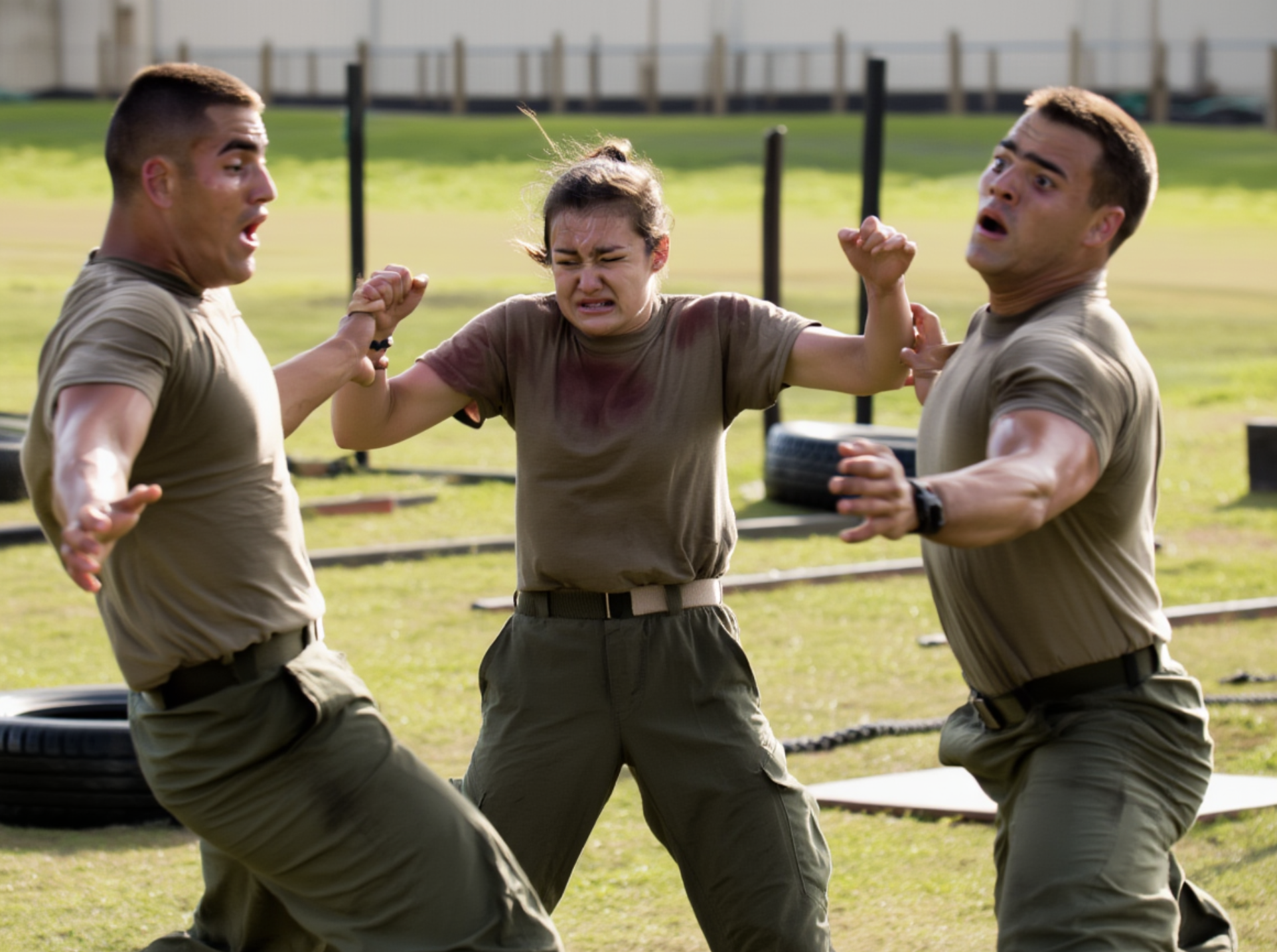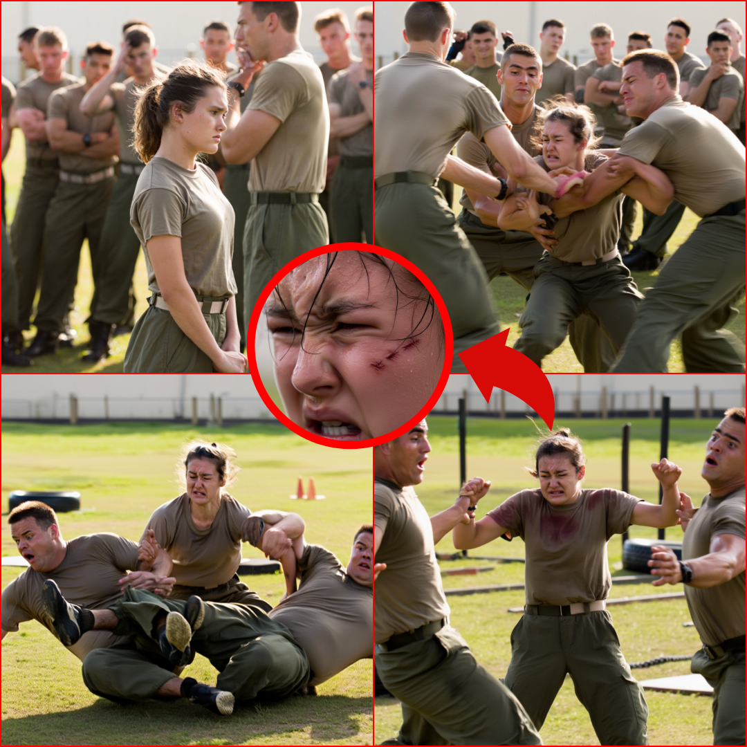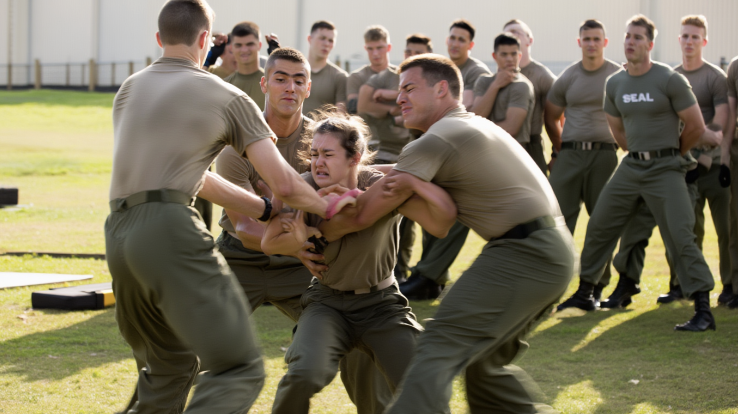 Reynolds snarled, advancing with the training knife like a predator closing in on prey. Blood trickled from the corner of Cara’s lip, but the pain sharpened her senses, focused every sinew in her body. The SEALs leaned in, amusement vanishing from their eyes. This wasn’t entertainment anymore; this was a lesson, raw and uncompromising.