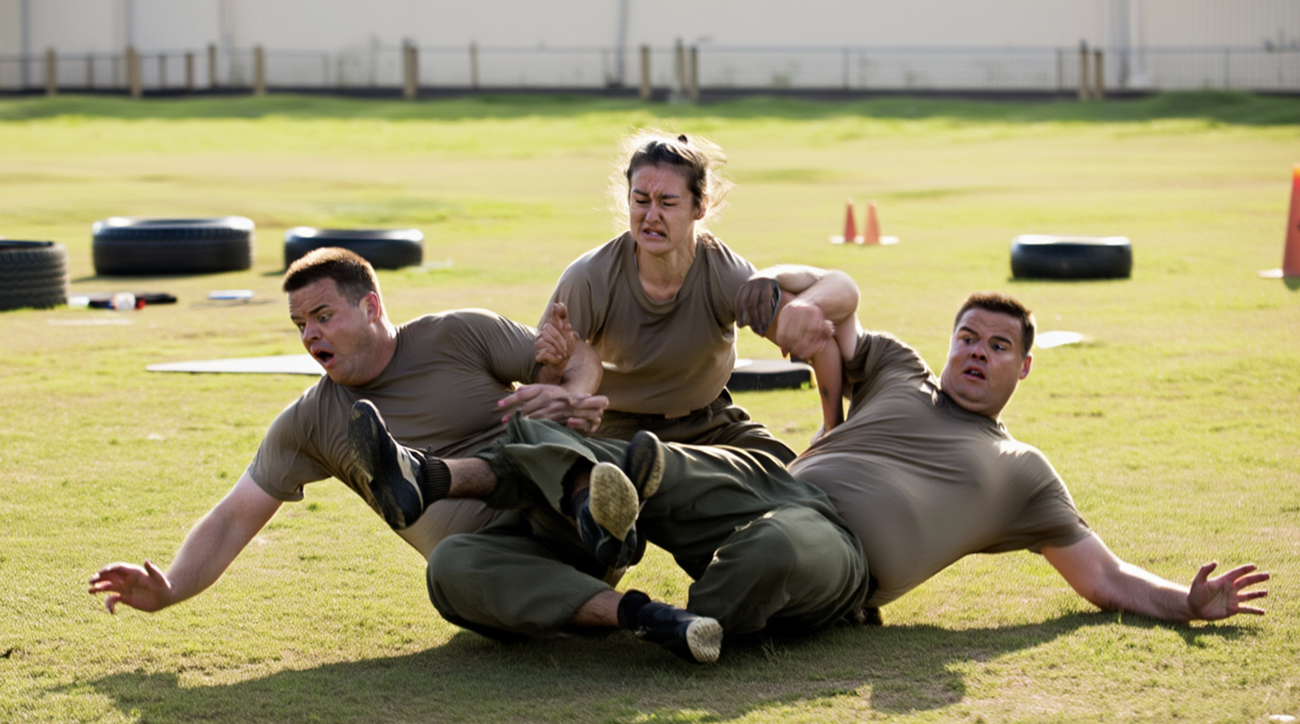 Both men lay there, gasping, defeated not just by strength, but by timing, anticipation, and unrelenting strategy. Cara stood over them, chest heaving, every muscle taut, eyes blazing with intensity.